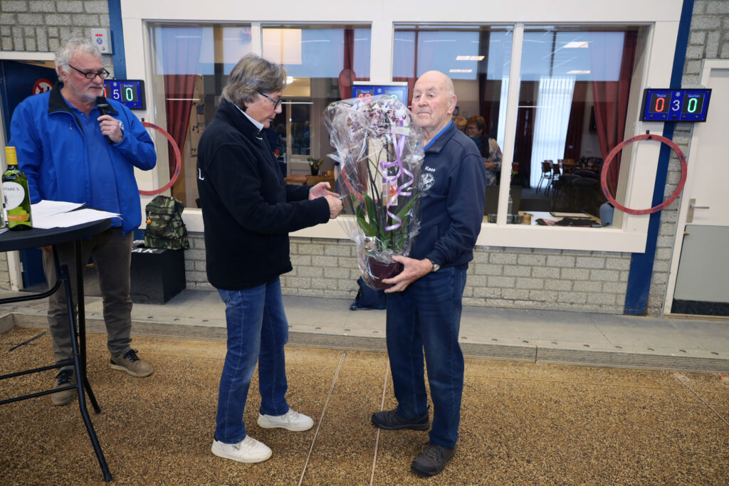 “Zonder Kees geen Cyclus,” klonk het vanuit het bestuur. Als blijk van waardering werd Kees naar voren geroepen om in het zonnetje gezet te worden. Wedstrijdleider Marianne van Tuijl overhandigde hem onder applaus een mooie bos bloemen en een cadeaubon namens alle deelnemers.